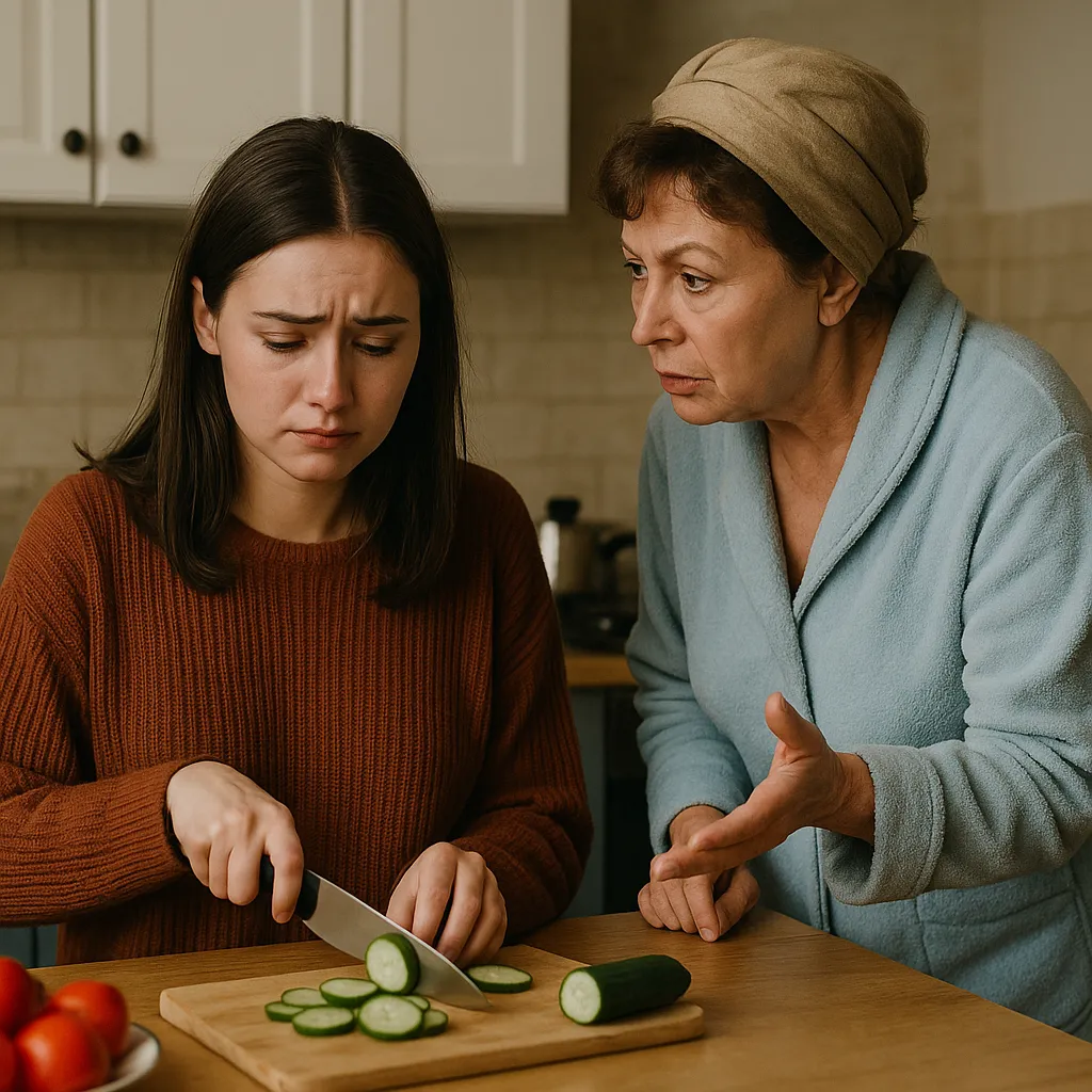 Лера резала огурцы — ровными, аккуратными кружочками. На самом деле, дома она так не делала, только здесь, потому что Валентине Петровне нравилась такая нарезка. Свекровь стояла у плиты, помешивая суп, и говорила, говорила, говорила…..Ерунду какую-то….И вдруг: будто бы ни о чём: