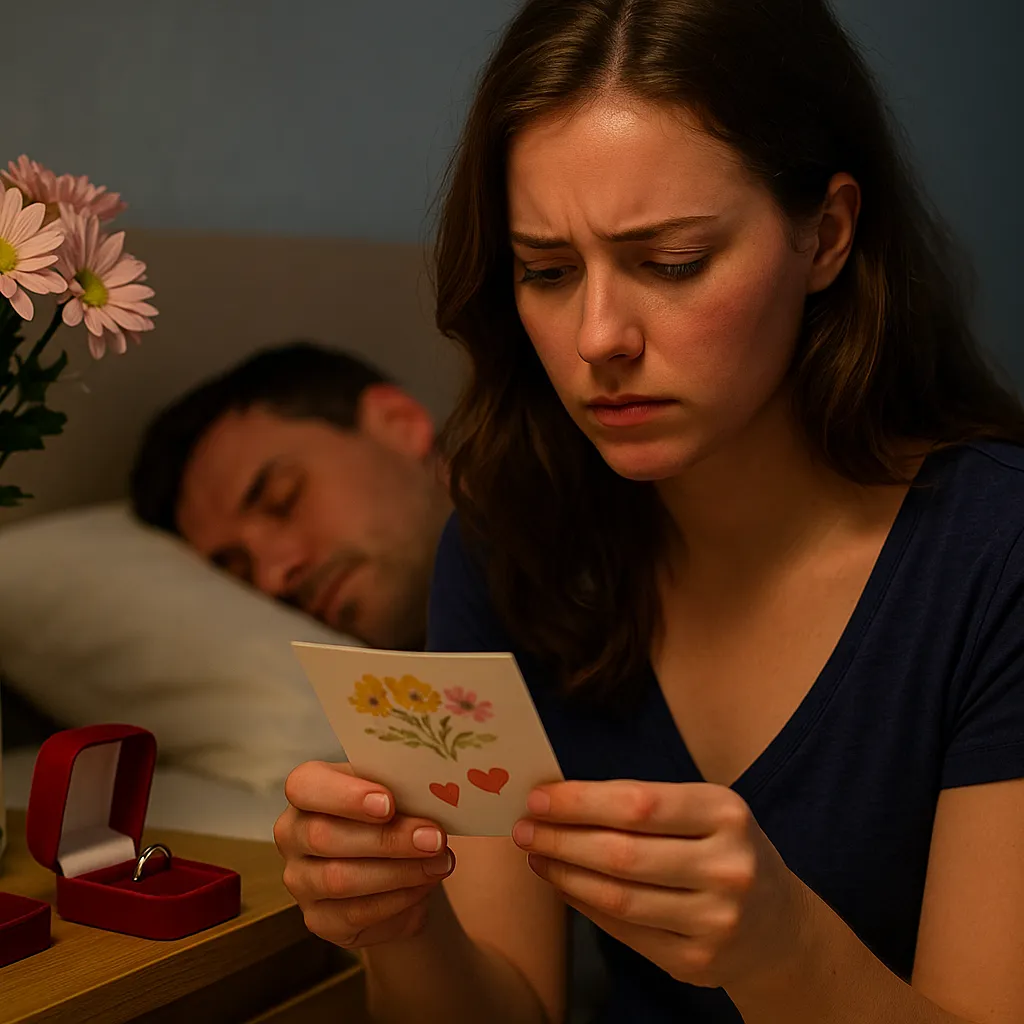 Нежный букет цветов стоит на тумбочке, рядом — коробочка из под колечка, а любимый муж просто устал, и уже спит, ведь у неё всё просто замечательно…