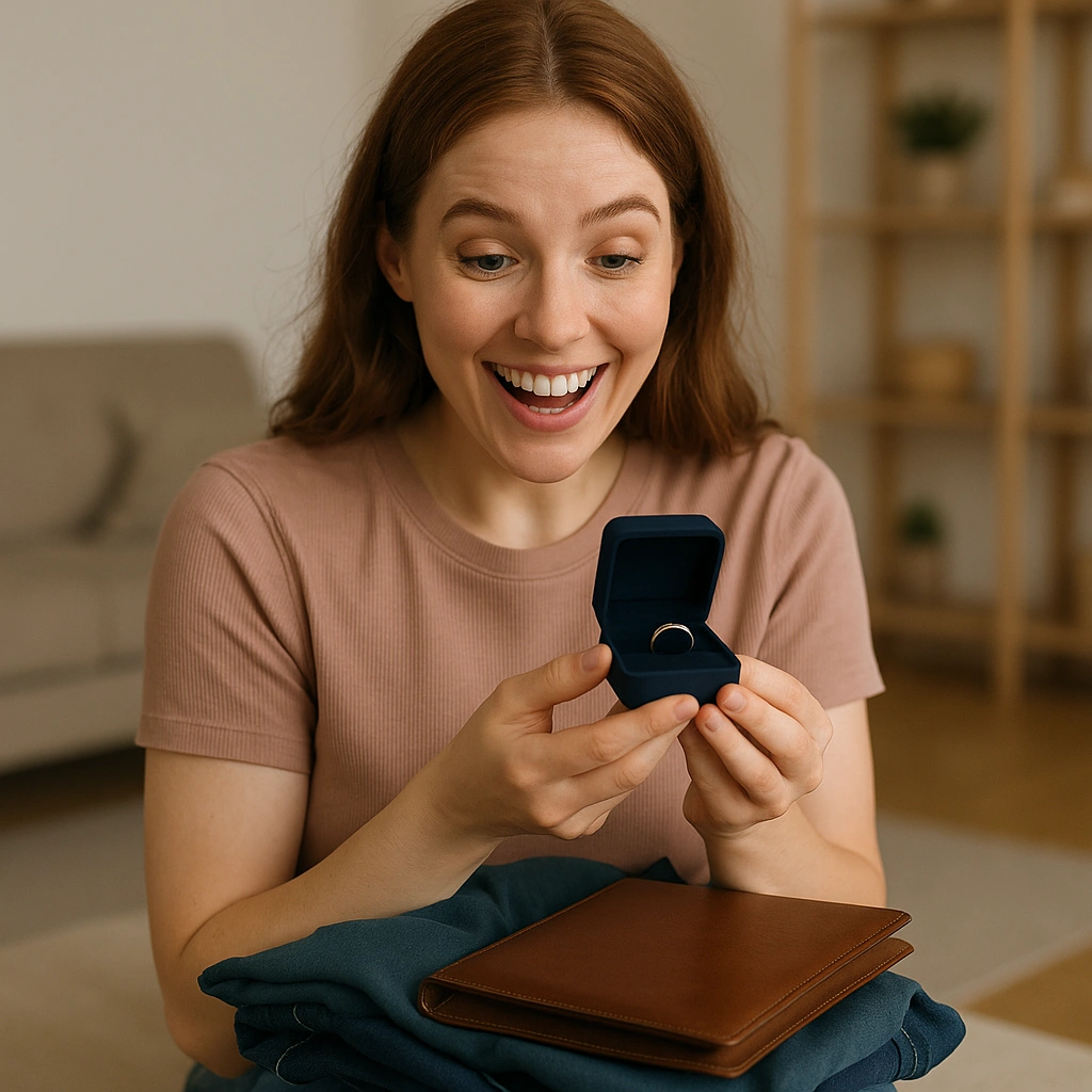 Вещи, которые постоянно разбрасывал сожитель Кристины, Никита, сильно раздражали. Девушка взяла кофту парня, шорты и кожаный планшет, чтобы убрать все это в ящик. Но вдруг из кармана планшета что-то выпало. Кристина подняла бархатную коробочку и, открыв её, увидела золотое украшение. Это было классическое обручальное кольцо, о котором девушка давно мечтала.
