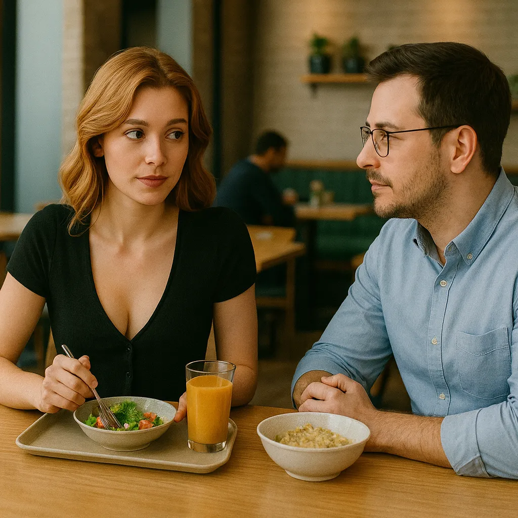 Многие в целях экономии ели в кабинетах принесённую из дома в пластиковых контейнерах еду. Но Катя ходила в кафе, где могла немного пообщаться с сотрудниками из других отделов офиса. Взяв легкий салат и стакан сока, она отошла от прилавка с подносом и осмотрелась. Увидев махавшего ей айтишника Гошу, она направилась к его столику.