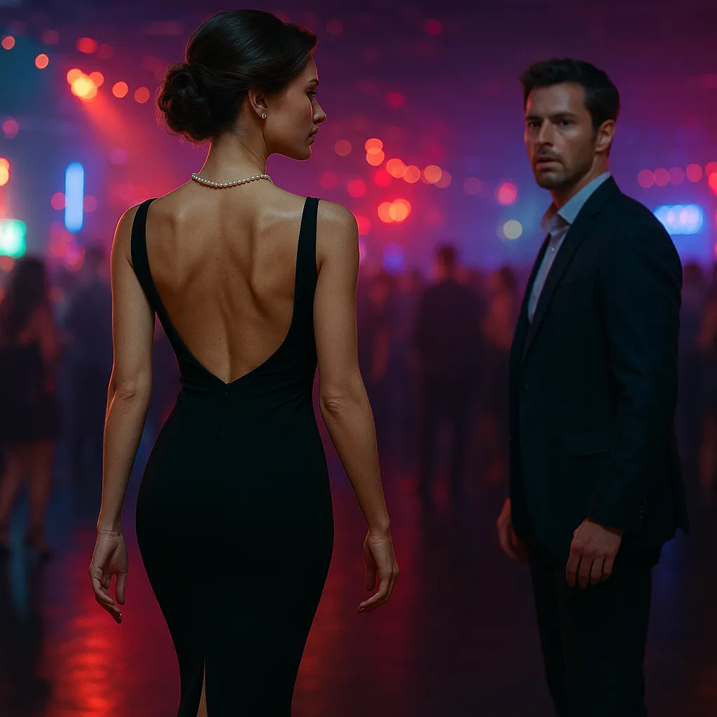 Альбина вошла в клуб неспешно, уверенно, будто хозяйка этого места. Она не торопилась, не озиралась по сторонам – просто шла, чувствуя на себе взгляды. Чёрное платье облегало фигуру, подчёркивая каждый изгиб, глубокий вырез на спине притягивал внимание. Туфли на головокружительной шпильке делали её походку особенно грациозной, а нитка жемчуга на шее добавляла образу чрезвычайно эффектную ноту.