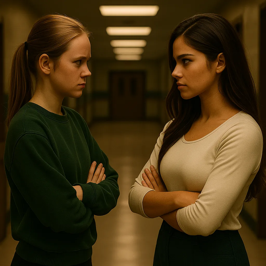 Аня молчала, сжимая кулаки в карманах. Она смотрела прямо перед собой, стараясь не встречаться взглядом ни с обидчицей, ни с её окружением. Внутри всё кипело, но она знала: стоит ответить – и ситуация только ухудшится.