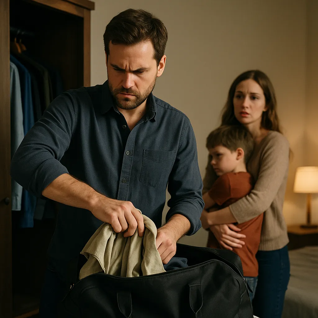 Настя стояла, всё ещё обнимая сына, но теперь в её взгляде появилась растерянность. Она не ожидала, что Гриша начнёт собирать вещи.