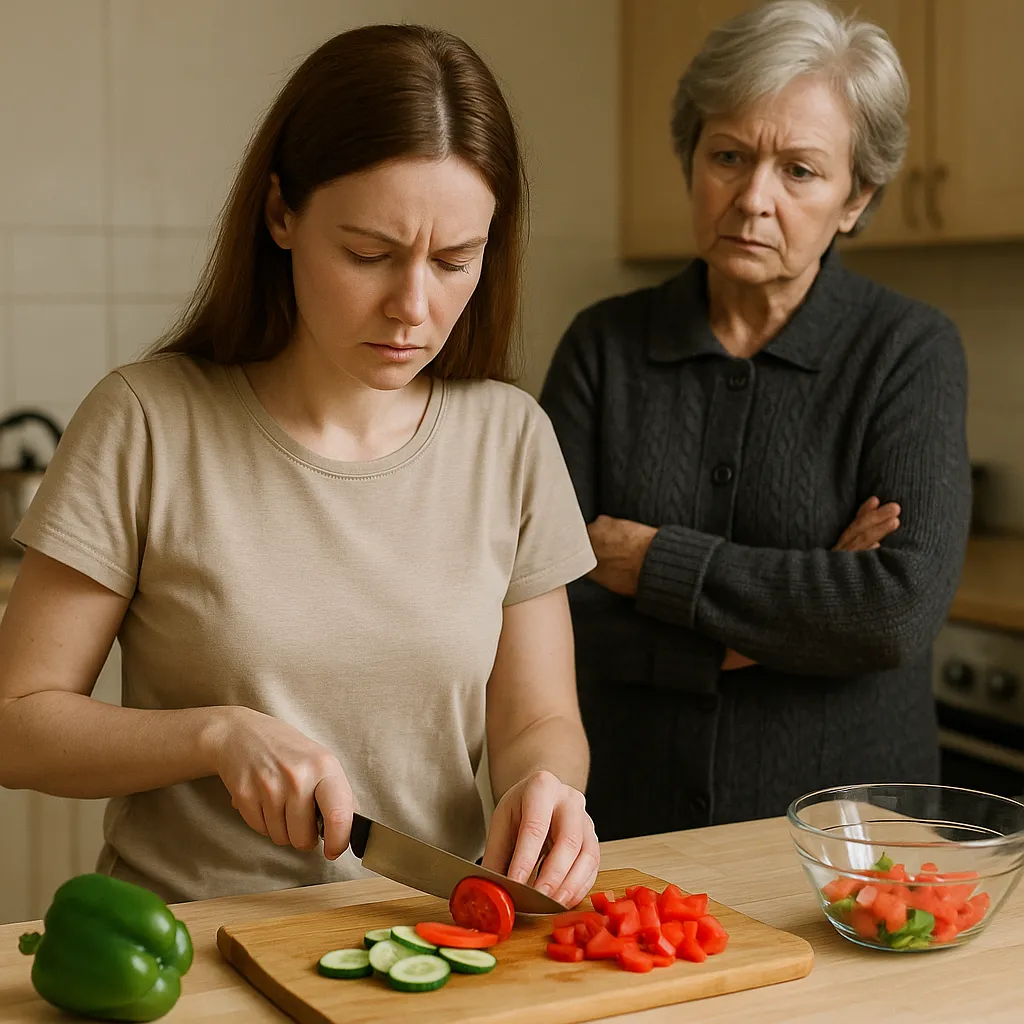 Ольга стояла над разделочной доской и нарезала овощи для салата. Свекровь Лидия стояла над душой.