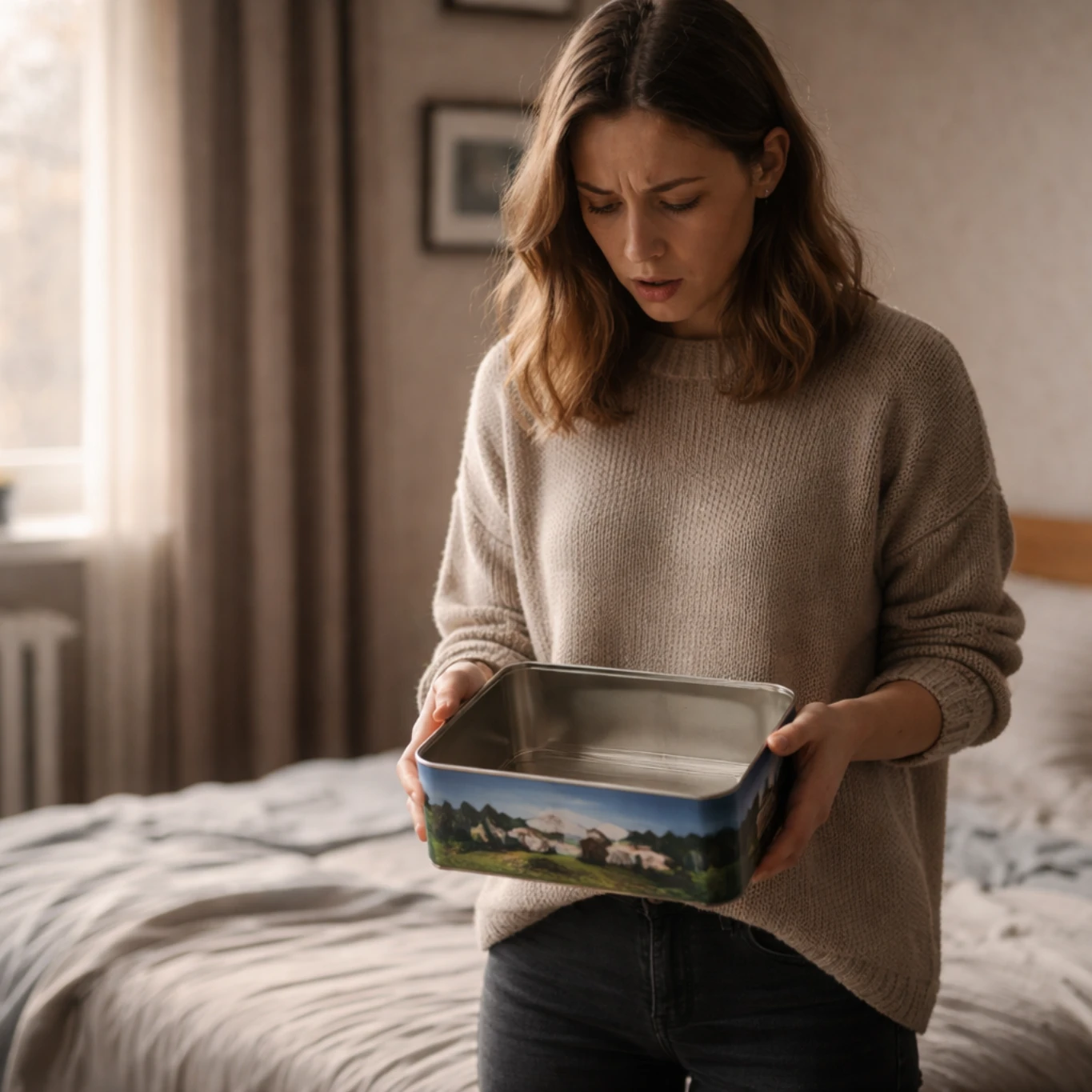 Алёна стояла посреди спальни и не могла пошевелиться. Руки ещё сжимали пустую жестяную коробку из-под печенья с нарисованными на крышке альпийскими лугами и глупыми коровами, которую она купила специально, потому что кто вообще додумается искать сбережения в коробке из-под печенья?