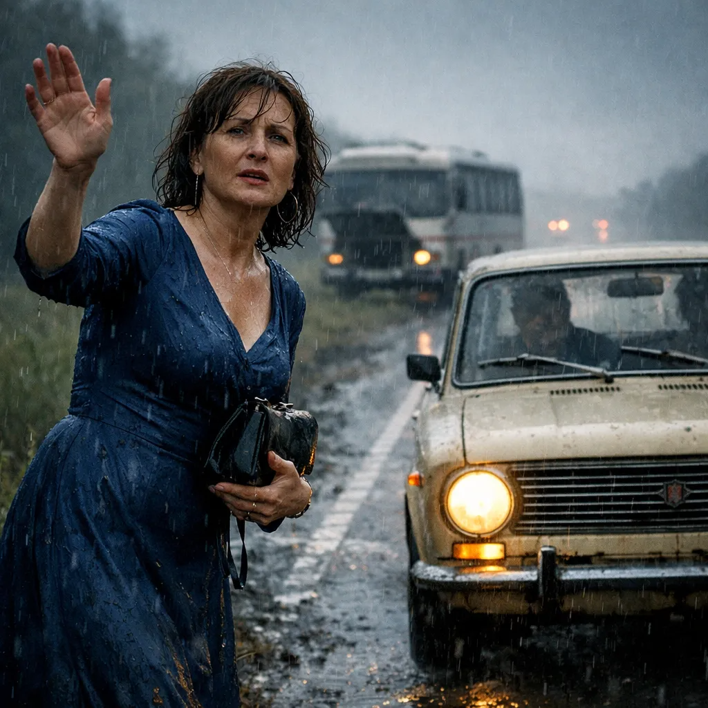 Галина вышла на обочину. Трава мокрая, туфли сразу потемнели. Выставила руку — первая машина пролетела мимо. Вторая. Третья притормозила: старые жигули, за рулём дед лет семидесяти.