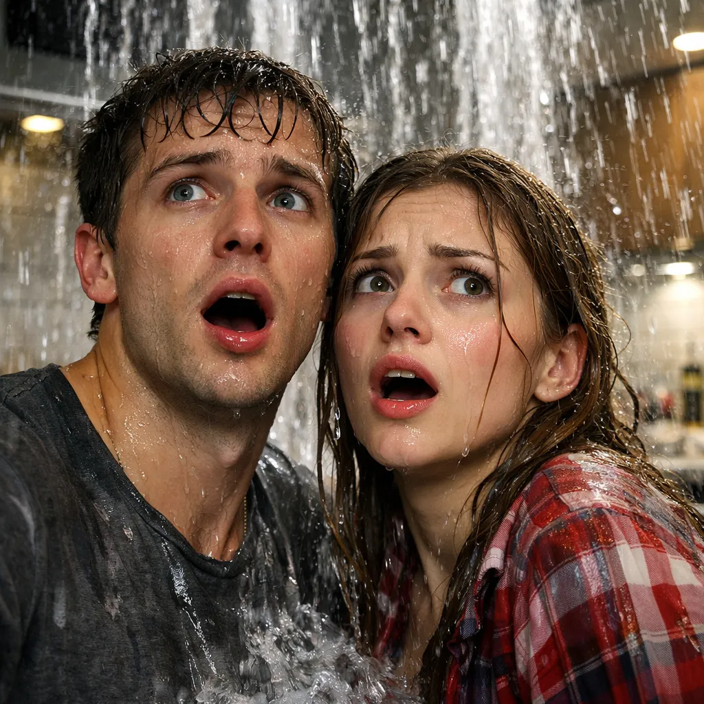 Ночью было тихо. А утром их разбудил странный звук. Будто рядом был водопад. Маша первая вскочила с кровати и побежала на звук. На кухне с потолка лилась вода.