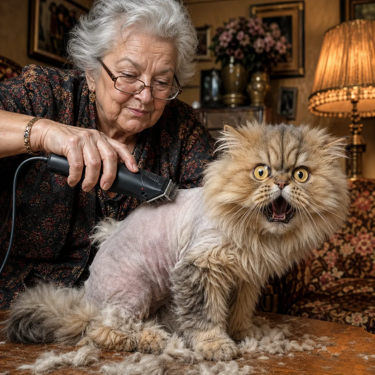 Хозяева со спокойной душой передали Юлия в руки тётушке и отбыли на моря. Попробовав раз вычесать шерстяного подопечного, получив от него порцию глубоких царапин и суровый взгляд, сопровождавшийся злобным урчанием, тётя Люся, не раздумывая, побрила его налысо, оставив волосатой голову с ушами, и просто протирала кота влажной тряпочкой.